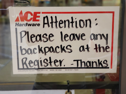 Read moreSo this sign is basically saying we trust women with purses, but don't trust men with backpacks.(Men don't carry purses) Very discriminatory message. They are also are saying we don't trust you, but we want you to trust that we will not steal from you. Of course I want to know if they will be responsible if they hand my backpack to the wrong person... I will take my business elsewhere. I am seeing more and more of this at Ace Hardwares in Florida. Very dissapointing.