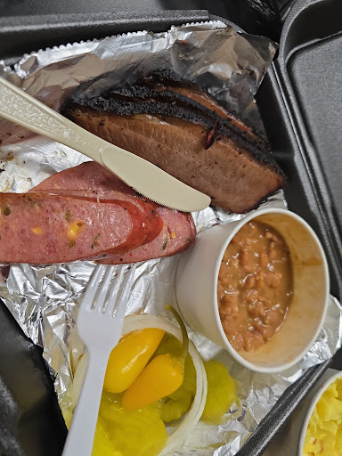Tried this BBQ truck 03/13/25. Honest review of the Brisket plate with a added sausage. The plating was done very nicely in the to go box and even with a little foil to help keep the food warm. The Brisket looked very good, was very moist and tender.with a nice outside bark on the meat...however it lacked on flavor I definitely had to use the included BBQ sauce. The pinto beans were good with added bacon bits had notes of garlic and spicy pepper. The sausage was a decent jalapeño and cheese stuffed it didn't really have a smokiness flavor to it that I was looking for. The potato salad was not bad its a mustard base. The bbq sauce is a standard sweet sauce that reminds me a lot of the Kraft Honey BBQ sauce. Staff was friendly and service was fast. Truck was located in a clean area so that was a plus. Pricing is a little high in my opinion I payed 29$ for the Brisket plate that had 1 sausage added on along with a $2 can of Dr.Pepper. Would I eat here again? Eh if someone brought me some back I...