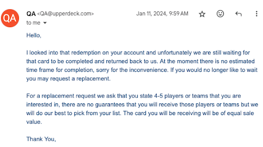 On June 22nd, 2024 I again reached out to UD for my card. This time they stated my card was never received from production ( say what ??) and they are not able to send the card I won. Pick 5 players or 5 teams and we’ll send you some type of card that WE deem to be of same value. Value is subjective to a fan.