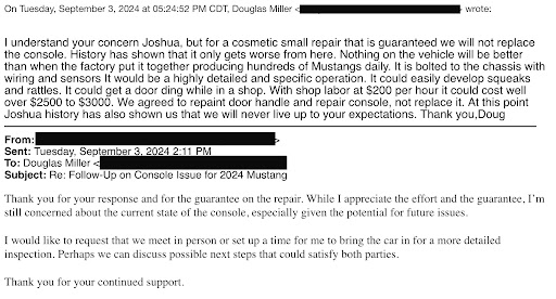 Console Repair Issues and Dismissive Attitude: Additionally, my brand new Mustang had a cosmetic defect on the interior console and a paint chip (down to the metal) on the door handle. While Five Star Ford eventually addressed the door handle to my satisfaction, the console repair was another story. Instead of replacing the part, they applied a quick fix that feels rough to the touch and inconsistent with the car’s quality. I can even see where it was taped off before adding the coating. When I expressed my concerns to Doug, the Sales Manager, he dismissed me with “statistics” about car repairs and essentially implied that I would “never be satisfied” – even though I was simply requesting a repair that matched the standard of a new car.