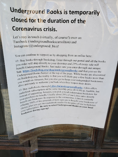 I haven't been there very often at all, but got the urge to stop by yesterday. When I did, I found the following sign posted on their doors (see attached picture) which indicates that patrons can support UB by purchasing books through the Libro app/website. (FYI, the site requires a subscription, but customers can get a free trial period to check it out first).