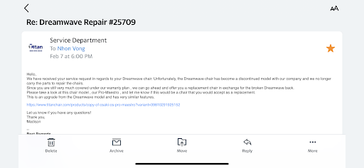 Read moreWe were gifted with a $5,000 chair. Unfortunately, out of the box the lower lumbar rollers did not function. I contacted the company. Since it was gifted to me, it was not under warranty for me which was fine. I informed the associate that I don't care about the warranty. I just need the motor for the lower. I informed them that I'll be more than glad to pay for it. They told me they couldn't do that because one of their technicians had to do it. I said that's fine. Send one of your technicians and I'll pay them as well. Titan chair company told me "NO". They said unless it's under warranty, they can't sell me a part for the chair. They can't send out technicians. I am stuck with a broke chair unless I bought it directly from them AND only if they can find the warranty. So now I have a useless chair from a useless company. I even pleaded with them that the chair was an anniversary gift to us. I let them know that if they take my money and fix this chair, I will buy 2 more for the office lounge. Nope. They didn't want to hear it. Again. Useless chair. Useless company. Never will I support this trash company. Now it just collects dust in the corner. The only reason I keep it is so whenever guests come over and ask about the chair, I can inform them to never buy one from...