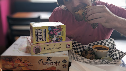 3 Arrows Games is a cozy place with several tables to play board games or trading card games at. The decorations inside have nods to different games [honestly, take a minute to look around and figure out what games are represented by the paintings and such].