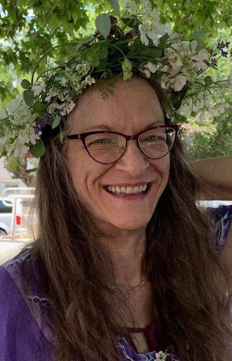 Here is a pic of me trying on a flower crown I wove by hand at the florist kiosk the second Saturday in June at the farmers market.
