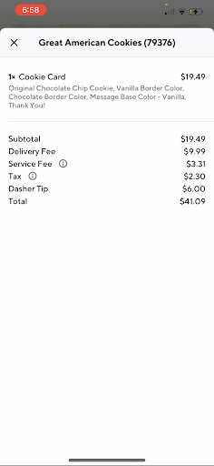 I placed an order for a super cute “thank you” cookie cake for a friend on DoorDash around 3pm. My order was confirmed and my card was charged. The cookie cake was set to be delivered to their home between 7-7:30pm.