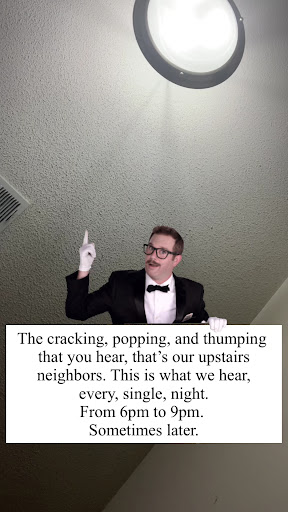 The neighbors above us just canât seem to understand, that because the unit they are currently in has flooded before, their floor boards (which are our ceiling joists by the way) creak and crack so loud sometimes I wonder if they may give out one of these days. Iâm not asking them to not enjoy their apartment, but they clearly have someone living up there that either hasnât discovered the balls of their feet yet, or just doesnât give a flip what we are forced to listen to from 6-10pm, and sometimes later, most nights.