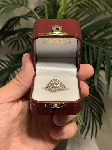 Read moreFunny story...we stopped into JM Edwards on whim (on our way to lunch) to start our education and shopping for an engagement ring. We never went anywhere else. Sarah greeted us when we arrived and worked with us through the entire process. We are not traditional couple shopping for engagement rings in terms of our age, length of relationship, aesthetic, etc. Also, we had a budget in mind-and to be honest, we did not think that we would be able to stay within our budget at JM Edwards. After the initial consultation where Sarah educated us about the important considerations, we decided to have JM Edwards custom design the ring. I had a very specific art deco-ish, architectural design in mind. The first step was ordering diamonds. Of course, I wanted a more rare cut of diamond...We were happy with the selection and were able to make our choice. The deposit was made and the ring design phase was started in earnest. I provided some inspiration photos and specifications. They provided images that were designed around the specs of the diamond we selected after getting input from the goldsmith and designer. It took 2-3 iterations of getting updated CAD drawings and then my feedback to get it perfect in my eyes. They could not have been any more patient with us during this phase. Today, we picked up the ring and it is gorgeous. It looks better than we imagined. It is just perfect. I will post a picture after he proposes. The experience could not have been improved at all. We are thrilled that we were able to shop at a local business and get exactly what we wanted, at a high level of quality, and within our budget. Thank you all so...