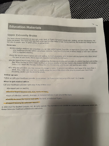 Read moreUnless you have an obvious broken bone or are about to die and had no choice on where the ambulance takes you, and especially if you are from out of town DON’T COME HERE. Had a nasty slip and fall and can’t move my arm without unbearable pain, so I thought it was broken or that I may have torn a ligament or something. I was sat in a chair along with many others, with a privacy sheet between us, in excruciating pain, and never Thoroughly examined. I did get an X-ray but, that made the pain 10000 times worse and was sat right back in a chair crying like a baby and ignored. After all that in a nut shell I was sent home wIthout a real idea of what’s wrong with my arm outside of not having any broken bones and read (yes, I read it on my own cause obviously I wasn’t important enough to have my discharge instructions explained) upon the 2 page paper that they ushered me out the door with that my injury was deemed a “bruise” (I could still have a torn ligament or a rotator cuff tear, who knows) The doctor wasn’t nice at all. She seemed annoyed because I asked her to actually examine me and Instead, she ordered a ct, Which makes no sense, When an MRI would’ve been what I would have needed in my case, and they couldn’t do that because their MRI machine was broken. Why would a doctor order a test that they know is not the one that would help in my situation other than to run up a bill or to shut me up by hoping it would make me think you’re actually doing something. So I knowledgeably declined. She even sent home a lady with a 2 inch blood clot in her arm and told her it was a vein she wasn’t using…smh. I pray that that lady is OK because blood clots are serious. I included the “discharge instructions “ in the photo and highlighted what I was already experiencing while I was there and none of this was offered while I was there, to be honest, I can’t lift my arm nor was that checked, nor was an ice pack offered or a sling. On a lighter note, Some of the supporting staff was nice and caring, but overall…10 out of 10 would...