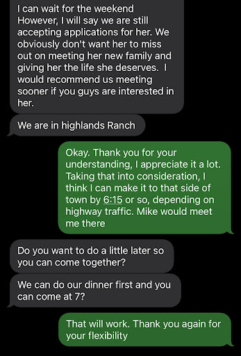 The foster advised us when we were setting up the greet, that if we were interested it would be a good idea to do it ASAP as they were still accepting applications. We cancelled appointments and moved plans around to make it work, just for it to be cancelled by the foster with very short notice. We were understanding, and asked the foster if our meet and greet would still be first as it was the soonest at that point. We waited a day or so for response, where we were basically told that we would not be given the opportunity to adopt at the meet and greet and they would decide on their own which family is best suited.