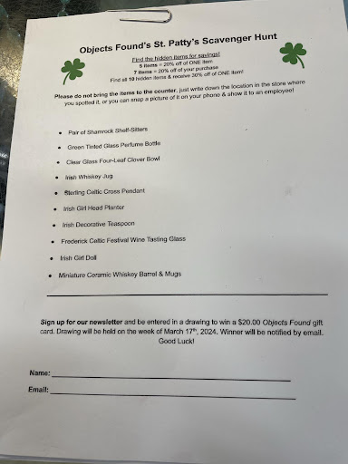 Don't think this is going to be a "pop in" store- there is just far too much to see. Filled to the rafters with just about everything you can think of, Objects Found is full of whimsy, memories of yesteryear, knick knacks, treasures and a lot of jolly useful stuff too. With a regular circulation of inventory, they do a great job celebrating the seasons. Christmas is a delight and St Patricks Day is a value add "Scavenger Hunt". Halloween is very special too. You can often hear from people inside the shop "My Grandma used to have one of those". Reggie, the owner is a treat. She has run this business for 28 years and is still passionate about every item and every customer- especially her regular people. She hosts wine and cheese nights and is very generous to the Catonsville community. Come and spend an afternoon catching up with all the different items within the walls and...