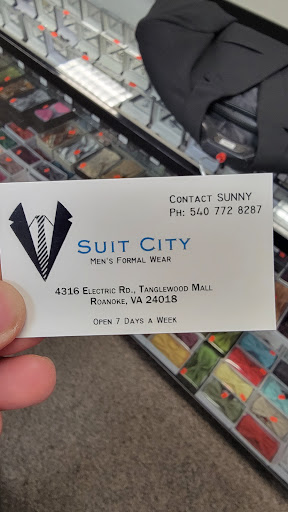 Read moreI just left Suit City a few minutes ago. Without a doubt, this business deserves the five stars I gave it. Sunny provides excellent service. I needed a suit for an upcoming funeral. My old suit no longer fits. I explained my situation to him and he quickly put together the perfect combination of shirt, pants, coat, and shoes (I already have appropriate ties). Most importantly, he hemmed the pants immediately to the proper length. I seriously doubt I could have received this same attention at any other suit shop in Roanoke. To sum it up, if you are looking for a large selection of top quality suits at affordable prices, look no further than Suit City. I will shop there again!