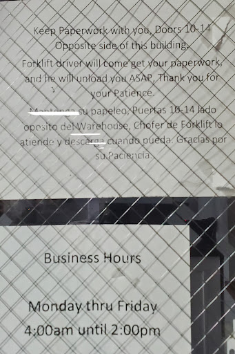 Read moreSunday alert! Appointment on Sunday 2pm so reached 12pm but nobody for check in just wait in line because other drivers told me they will knock your door and take papers & give you dock but one guy came around 4pm and said just back on dock but don’t open trailer door when I again come for paper then I will let you know. 2:30am they knocked door & order for open trailer door and back in but he said we need 2 hours & he came with papers 5:20am. No restroom but neighbors have ( not clean)overnight parking available.Total 17:30 hours process but 4 drivers front of me they came early morning so they empty before me, around 8...