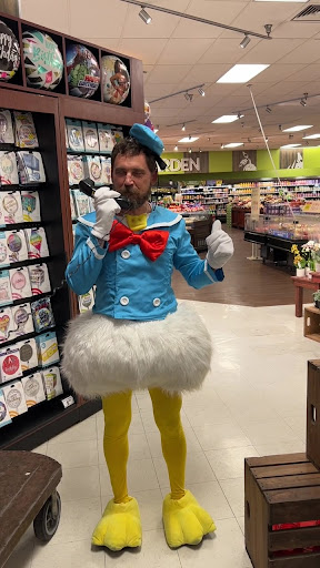 Walking into Kroger's floral department, you'd expect the usual scene – flowers, gifts, and balloons. But on this particular day, we were treated to an extraordinary sight that turned a regular chore into the highlight of our week! Mitch, donned in a Donald Duck costume, complete with yellow tights, webbed feet and a dashing sailor suit, stood at the heart of it all. He wasn't just picking up balloons; he was delivering smiles and a performance that would rival any Disney parade!