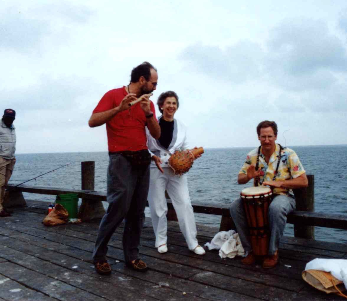 The overcast sky draped Cedar Key, Florida, in a soft, muted light on a tranquil morning in the early 1980s, long before the hurricane would claim the historic public fishing pier. The wooden pier at the end of Dock Street stretched out into the Gulf, its planks weathered but sturdy, and its low rails—perfect for sitting—hugged the edges, inviting visitors to rest and take in the salty breeze. Bobby, Margo, and Norm had made their way to the pier that day, a trio of friends with a shared love for music and the simple pleasures of island life. Bobby, in a bright red shirt, stood with a flute pressed to his lips, his fingers dancing as he coaxed out a lilting melody that seemed to float over the water. Margo, dressed in a crisp white outfit, held a woven percussion instrument, shaking it gently to add a rhythmic texture to Bobby’s tune, her smile wide as she swayed to the beat. Norm, seated on a bench with a djembe drum between his knees, kept the heartbeat of their music alive, his hands tapping out a steady rhythm in his floral shirt that matched the laid-back vibe of the day. At the far end of the pier, old man Tucker, a grizzled fisherman who’d spent more years on this pier than most folks had been alive, paused from tending his line. His tackle box sat beside him, a green bucket nearby for any catch, but his attention was on the trio. Tucker leaned against the low wooden rail, just the right height to sit on if he’d wanted, and watched with a quiet amusement. The music, a blend of Bobby’s flute, Margo’s shaker, and Norm’s drum, filled the air, mingling with the sound of waves lapping against the pilings and the distant calls of gulls. The pier felt alive with their song, a moment of harmony that captured the spirit of Cedar Key—unhurried, connected to the sea, and full of small joys. A few other locals lingered nearby, some fishing, others just soaking in the scene, the low rails making it easy to sit and listen. As Bobby hit a high note, Margo laughed, and Norm’s drumming picked up, Tucker tipped his hat in silent appreciation before turning back to his line. The trio played on, their music a memory etched into the pier’s wooden heart, a snapshot of a simpler time before the storm would wash...