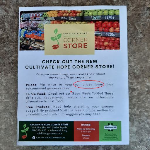 Read moreThe quality and price of the produce matched or exceeded my expectations. I also appreciated how efficient the store is - lots of locally sourced products, a wi-fi area, fresh produce and some prepared things (pastries, bread, pasta meal kits, chicken), and efforts to support local community needs. This is exactly what we need in a local grocer, and I'm excited to make Cultivate Hope part of my regular route.