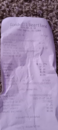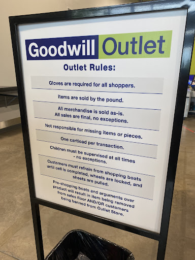 It's not a typical goodwill - at goodwill outlets, you dig though huge blue bins with random items inside. These bins are rotated every hour or so. Gloves are required for safety so bring your own (or you can buy a new pair of gloves there for $1.99). Items are sold by weight so ignore any prices that may still be on the items in the bins (the only individually priced items are the really big bulky/furniture items near the back corner of the store). Items are sold at $1.49/pound; paperback books are 25 cents each and hardcover books are 50 cents each.