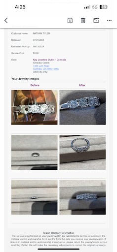 Read moreI had a very disappointing experience with Kay's. My husband purchased my ring there in March 2021, since then it has lost diamonds every couple months. I had gone to the Centralia location and they let me know in August 2023 if it happened again they would damage it out, and give me credit to purchase a new one. November 2023 it lost another diamond and when I contacted them the store manager was extremely rude and told me they were too short staffed for me to come in anytime soon, I could come in the store in a few weeks and if there wasn't customers she could help me. I then took my ring to Olympia not wanting to deal with a rude store manager, where they sent it out again for repairs, with a note to make sure I don't wear my ring while basically doing anything to avoid losing stones. I then expressed my frustration that I feel like I was sold something not quality. Their only solution was they would buy it back from me for what we paid, but I had to spend double the purchase price. I am very disappointed in Kay's, my husband and I will be purchasing a new ring elsewhere and I will never be a customer of theirs again. If I could give 0...