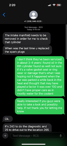 He came to service my 2008 avenger r/t and gave me a quote of $265 for a diagnostic when I told him multiple times that the 6th cylinder is misfiring his reader couldnāt read that but our personal and auto zones reader showed otherwise. He told me my head gasket was blown and he didnāt even do anything but unplug my spark plug and started the vehicle with it out. This is serious Iāve texted the Edgar his company information he still declines to contact back he said heād have to remove the intake manifold to see the 6th cylinder. He just called me in the middle of this review to tell me to shut tf up if I know what Iām doing and that he has no information to give me I didnāt ask for a refund but this manās recommended under the table work and said heāll fix it for a bit. When he told me he was a professional and when I said I hope this call is recorded he hung up and told me to stop fing calling him when I sent a text back describing I was unhappy for his work. The spark plugs he replaced were my own so I donāt mind to pay him for his ālabor and driving here as well as a diagnostic.ā He torqued them down with a drill gun btw. You canāt make...
