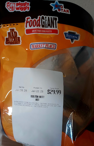 The Boston Butt precooked is pricey, but in the display case, it sure looked delicious.