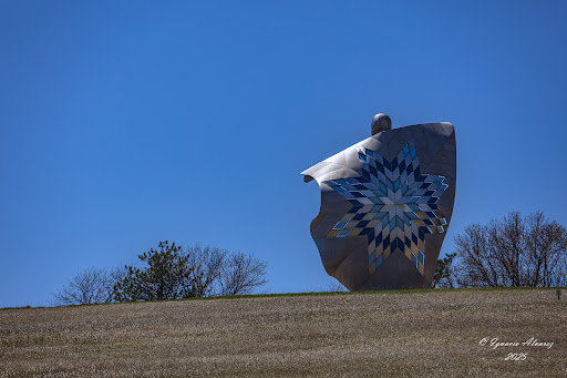 Read moreFrom Wiki: Dignity (a.k.a. Dignity of Earth & Sky) is a sculpture on a bluff overlooking the Missouri River near Chamberlain, South Dakota.[2] The 50-foot high stainless steel statue, by South Dakota artist laureate Dale Lamphere, depicts an Indigenous woman in Plains-style dress receiving a star quilt. According to Lamphere, the sculpture honors the culture of the Lakota and Dakota peoples who are indigenous to South Dakota.[3] Assisting Lamphere were sculptors Tom Trople, Jim Maher, Andy Roltgen, and Grant Standard. Automotive paint expert Brook Loobey assisted with the colors for the quilt, and Albertson Engineering of Rapid City, SD ensured the sculpture would endure the strong winds common in the area.