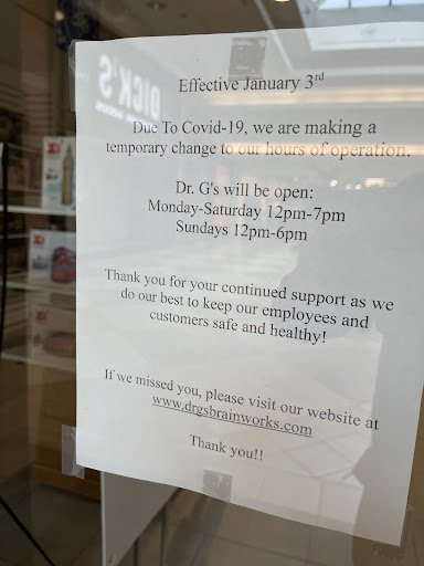 This place has some pretty cool stuff!! But here’s my 1-star rating. After a very long bad day at work, i broke my kid’s toy when i got home and was trying like hell to replace it asap. So i scramble to the mall and scurry around trying to find it before they close. I walk into Dr G’s.. Me: Hi there do you (gets cut off) Cashier: This store has a mask policy, sir.” Fyi I’m not vax’d, don’t wear a mask, and don’t avoid people. Haven’t had Covid after several exposures either. Me: Ya ok do you happen to have this? (Shows pucture” Cashier: “You still have to have a mask” Me: “Even for a simple yes or no?” Cashier: “Yes!” Me: “That’s pretty pathetic.”