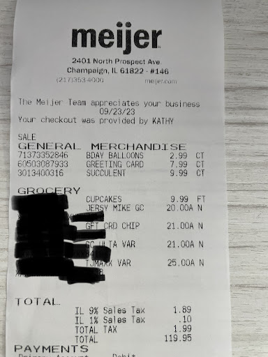 Read moreI have always had good experiences with Meijer in the past. However, this past Saturday, September 23rd was not a pleasant experience. I was shopping for birthday supplies for my daughter's 21st birthday. Among some of my items I was purchasing, was 4 Gift cards to put inside her card. Because I was getting gift cards, I decided to go to a lane with a cashier vs just going through the self-checkout like I normally do. I was behind 2 family's that both had large orders. I waited patiently as I was not in any rush. When it was finally my time to check out, I was not greeted by the Cashier, Kathy, instead I was greeted with "really?! ALL these gift cards?!!" with annoyance. She rang the 1st card up and asked how much I wanted on it, and I replied I wanted $20. I then immediately said, "wait, can I make that $21 instead?" Kathy told me no, and how me wanting to change it was going to make all the people behind me angry. I was told that getting so many gift cards takes too long already. Because she kept making it an issue, the lady behind me suggested I just put cash in my daughter's card and not get gift cards. I was shocked that the cashier was not wanting me to purchase the gift cards, and now I had people behind me telling me not to get them either. I politely declined the idea of just doing cash and had to tell the cashier that I did in fact want to make my purchases that I came to Meijer for. The next card had a minimum of $20 to add and I told Kathy that I wanted $21 on that one, she began telling me that it won't work, I had to do whole numbers. I had to tell her to please try typing $21 in to see if it would accept it, and guess what, it did! I never thought that trying to purchase gifts for my daughter would be such an issue! After I paid, it takes a moment for the cards to become activated, and as each activation receipt was printing out, Kathy REPEATEDLY apologized to the people behind me for how long this was taking and how THIS is why no one should purchase multiple gift cards. The entire experience made me feel very uncomfortable and frankly confused as to why my check out of 6 total items would be such an issue. I will just stick with Walmart, Target, or Schnucks from here on out for...