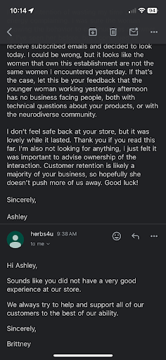 Unfortunately, I didn't feel like the customer service was really there. I've visited thrice now for different reasons with different questions and purchases and never once have I been acknowledged or greeted when I walked in unless I touched a jar or was ready to buy (mind you I've come alone with no one else in the store, with a family member, and when there were one or two others).
