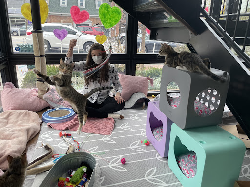 Read moreThis business is impressive!!! They have around 12 cats at max but sometimes less because they are all up for adoption. When I went, there were ten, and that was plenty! The cats are healthy and very energetic, and playful! All with different personalities. They live in a pristine and clean two-story cat mansion paradise with all a cat could ever need and more. I found myself wishing I could play with them all simultaneously because they all wanted attention! Order the gourmet pecan ice cream cookie sandwich to make your already elevated oxytocin levels shoot through the roof! The staff was such sweet and excellent caretakers. If you’re ever sad or need an uplifting hour go here! A few things to know: You need a paid reservation because most of the time, they are booked. You cannot eat or drink inside the cat area. Snacks and drinks, so don’t expect a meal here. There is unique good merch, cat toys, treats, stickers, headbands, etc., for cat owners and lovers. You can’t pick up the cats, but they will snuggle you and let you pet...