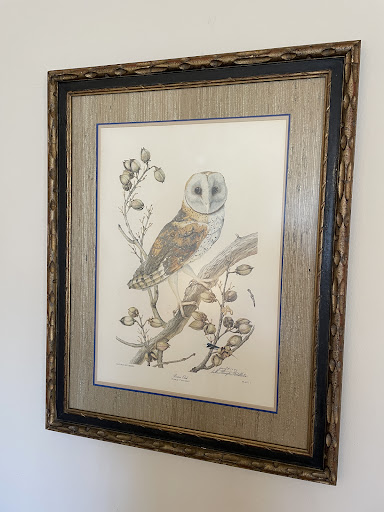 The large print is beautifully showcased in a three-mat design, with a textured mat, a blue outlined mat, and a neutral mat. The ratios of the mats are perfectly balanced to emphasize the print, and each mat plays a unique role in showcasing the beauty of the piece. The textured mat matches the texture in the print, adding depth and dimension, while the blue outlined mat makes the one blue feather in the print stand out and pop. The neutral mat serves as a background, allowing the print and the other mats to shine. Additionally, they attached document sleeves to the back of the frame to hold original certificates and information about the limited edition print and artist, which adds even more value to the final product. The frame and hanging hardware are incredibly sturdy, ensuring that the piece will remain secure on my wall for years to come. A Superb Owl!
