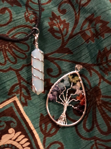 Hi ! I just found this Charming store this past week ! As soon as I walked in, It felt like Home ! What a beautiful variety of Crystals. I was immediately drawn to the Opalite pendant and a pendant with a tree and a variety of crystals in a tear drop frame. 10.00 each The prices are very reasonable and more importantly, the lovely lady was so friendly, knowledgeable and helpful ! I still smile when I think of this store ! The background fabric is a wrap skirt that I, also,...
