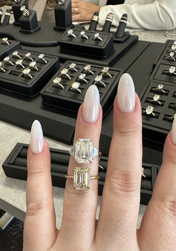 I absolutely love Moissanite and have done quite a lot of research on it. Before our viewing with EW Gem I initially went to check out Charles and Covard moissanite rings at Helzberg Diamond's up in Greenville. I originally was considering going with them because Charles and Covard owned the original patent for moissanite up until 2015. I had really high expectations with them because they have been making moissanite for 25 years. After seeing Charles and Covard in person I was very disappointed with their moissanite stones. They almost looked see-through and glass like, similar to costume jewelry. (sorry but I forgot to take photos at Helzberg, I recommend you go see yourself though 😬) I actually felt pretty nervous about the showing for East West Gem Co because of my prior experience with Charles n Covard. But I am SO glad we made that appointment though. Their stones are way more beautiful in person than in their pictures. I am absolutely blown away with the quality of their jewelry. I always stop by jewerly counters literally everywhere I go and this is hands down some of the most gorgeous stones I have ever laid my eyes on. ✨️ I would definitely recommend buying from them even if you can't do an in-person showing. Their pictures perfectly reflect the fire of their stones unlike the many other companies I've seen online. I looked at every stone on their website for weeks before our showing and they were just as beautiful and even more gorgeous in person. I would completely trust repurchasing from them even without a in-person showing. They told me you can even do a zoom viewing as well if need be. Alexa S. made our experience very comfortable and explained everything thoroughly!