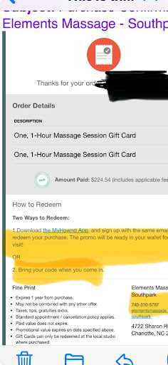 This review is not for a massage but the redemption process of an online gift card purchase. The gift card was purchased for me by a friend which is appears to be processed not by Elements but a 3rd party named MyHownd. Email Instructions were sent to the purchaser to redeem the GC…option 1- download app, get code. Despite using the email that was used to purchase the GC, this attempt was unsuccessful. Option 2- use code….hmmm…no code in the email with purchase confirmation.