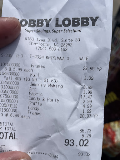 Read moreI’m completely crushed by my experience at this location. I’m disabled and have been wanting to visit hobby lobby for over a year. Today it took 2 buses and I finally arrive but my phone is dying FAST !! Once I realize while in the fabric department i quickly try to find an outlet. The nice lady in fabric said she didn’t have one but to try in the frames department. No one in frames so I went up to the cashiers and waited patiently then told them my situation. I need my phone to track the bus and to shop. They offered no help but plenty of dry attitude with no empathy for my situation. The cashier was clearly irritated and called a manager over -she didn’t care to help either. They all said there aren’t any outlets. I asked the manger could I give my phone to her and she can take it in the back office and let it charge a little. She told me no she can’t do that. So I left the front of the store trying to figure out how to use my phone to help me shop for what I need and praying my battery last until I can safely get on the bus . Thank goodness for their lamp section- I stumbled upon while looking for outlets. I also saw that there are open outlets on almost EVERY pole it’s just higher up. Needless to say I go to check out and saw the same lady who stated she didn’t know where any outlets were. I gave her the benefit of the doubt that she actually didn’t know so I say real friendly like that I found one and there on every pole(in case another customer is in my situation) Again I’m met with an attitude and dismissed. Sadly she’s also the one who handled my purchase. I felt extremely unwelcomed from the manger and staff. The vibes weren’t what I expected. I REALLY wanted to enjoy my outing but how they treated me changed my entire mood. This is my favorite season for DIY and while battling cancer I just wanted to have this day and enjoy the colors, decor and variety in store. I hope the workers and manager really evaluate how they handle paying customers or just humans in general. You never know how bad someone may need just a little kindness or help goes a long way. Hobby lobby customers clearly come to experience the store and the many gems it offers. The 1st experience walking through the doors or with staff should be warm and welcoming. I traveled for a...