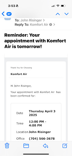 Ā Ā Ā Read moreGreetings everyone! A young lady by the name of KARIAH just left our home and she did a superb job! I was truly impressed! I was worried things would be ābandagedā as usual and Iād be calling back in a day or two. We have had maintenance out here a couple of times before concerning our unit. Too hot/cold/no heat or air flowing thru the upstairs vents. And the unit would work for a while and then fall back into a state of malfunctioning. Sad to say, I thought after they āfixedā it and it stopped performing to its fullest capacity again and maintenance knew it, then itās ok. WHY WOULD I THINK LIKE THATā¦Because they are educated on that particular thing and KNOW what it needs to make sure the home functions well and is safe the family to use. So donāt judge meā¦lol I have to say I was very impressed with KARIAH! She kept me informed with every issue she came across and what she needed to do and did to correct it. She was here over an hour and she saw some things that were not as they should have been and she corrected them! (This is a new build close to 3yrs) She corrected the things that shouldāve been completed and in full operation before we moved in. After finding those āāissuesāā she made SURE that everything was operable as it should be for our safety and comfort and before she left, she double checked everything and gave us the final details, reiterating everything she had done from start to finish. I had questions in the end right before she walked out the door and she answered them with no hesitation. Plus, she added: āif I missed anything or you need us again, give us a callā¦ā She represented Komfort Air very well⦠My unit is functioning as it should now! The air is flowing properly as it should and now that I know more about this piece of equipment, let it mess up again. Iāll be calling. If it does get to that point, If we donāt see KARIAH, we best have someone as knowledgeable as she is! I hope she gets to read this: KARIAH, much gratitude to you, your patience with our unit, gratitude for your time that you stayed to make sure our unit was functioning properly and safe for us to use. Gratitude for keeping us abreast of things as you worked, š¤£my son just came downstairs and said itās actually COLD IN HEREš¤£š¤£š¤£ no one has EEEEVER, ever, said that since weāve been hereā¦you did a great job! Tell your boss this family says: you need a bonus! We are happy and Iām proud to have had you as the one to service maintenance...