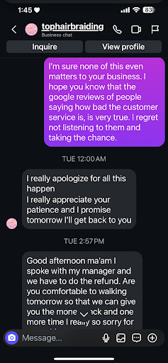 Ā Ā Ā Read moreDONT WASTE YOUR MONEY Mixed Girlies Must Read: I had a terrible experience at this shop today. First off I was not charged the $75 as quoted for 2/4 stitch braids. The woman charged me $100. After she did ONE braid, I told her I didnāt like it because it went straight back. (They should have been Indian style) She began to complain about my hair being ātoo softā to deal with and saying that it was a struggle to braid. When I said āok, then you can just take it down and Iāll goā she was obviously annoyed and said, with quite the attitude āthen youāre gonna pay me for my time and the hair I usedā. I asked her how much, $25. I said ok⦠she began to take down the 1 braid that she did. When she stopped in the middle, I asked if she could braid it closer to my ear from there and see how it looks. She did, and I liked it. So she agreed to continue. However, she did not do the other side the same way. She did it straight to the back. At that point Iām sure she talked about me, in her native tongue, to the entire shop as they kept looking and smirking, so instead of further embarrassing myself, I let her finish, paid her and left. I couldnāt get home fast enough to take it down. $100 wasted because she wouldnāt do the style I asked. She kept saying that āI donāt have the kind of hair for braiding, itās too softā. I find that very offensive. Iām mixed race and I have naturally curly hair. Iāve had my hair braided many, many times over the yrs and Iāve never had any problems. I literally came into the shop with 2 Indian braids, I just wanted hair to be added so it would last on vacation. I donāt appreciate her overcharging me and then attempting to bully me into paying her after only doing 1 braid. Please read the reviews and donāt waste your money. Especially my mixed girlies, clearly our hair type is a problem for this āprofessionalā hair braiding shop. UPDATE I sent this exact review, advising of my experience, via msg to the person I was in contact with on IG the same night as my appointment. The person responded at MIDNIGHT saying that they would get back to me the next day. They advised that I would be issued a refund and if I could come in the NEXT day. I was grateful and said I couldnāt do the next day as I was leaving for vacation (hence the reason for getting my hair done) but I could stop in later that night or when I returned. -No response until the next day. Further back and forth while I was on vacation. A woman FINALLY called me back the day after I returned. She was extremely RUDE telling me that I had 24 hours after my appointment to get a full refund if I wasnāt satisfied with my hair. I asked how would I know that, she said there is a sign in the shop (didnāt see it). So I could either get my hair done for free or get refunded half. I told her that I would never set foot in that shop after the way I was treated and the IG msg said a refund, not partial and I advised that I would be updating my Google review to include this correspondence. She said if I did that then I wouldnāt get any refund. Tuh⦠well I got half and Iām still posting this review. DO NOT SUPPORT...
