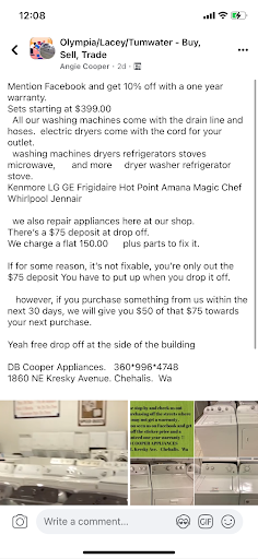 Read moreFirst time going into this store. Lots of selection of dryers, washers and fridges. Very helpful sales guys. Willing to explain everything to you if need be. They also have a 6 month warranty on there items which is nice since other places don't even give you a warranty worth anything. I found a couple options for dryers but needed to go home before I could ask about financial options. So I have them a call back and got the front desk lady why tells me they go through a different company for financial options and gives me a number to text. So I texted it and no response so I tried to call cause we really need a dryer and my phone says the number can't go through so she didn't give me the correct number to call to see if I can even get a dryer from them. They should be more willing to help customers who want to spend money in there store. But I need a dryer amd there prices are really cheap so I will keep trying. But other then that the store is a bit crowded and the floors need to be cleaned. They also need to wash there appliances correctly given its still covid and some of there appliances it smells like something died inside so beware and give it an extra good cleaning if you decide to buy anything. Some dryers are a little burnt in the back so be extra away also there's a good chance they won't work correctly. They have. Ovens Dryers Double door fridges Pairs of washer and dryers Individual washer and dryers Commercial size fridges for restaurants Small and large freezers. Older model fridges and new models fridges. Microwaves. Counter top and over the stove ones. Gas and...
