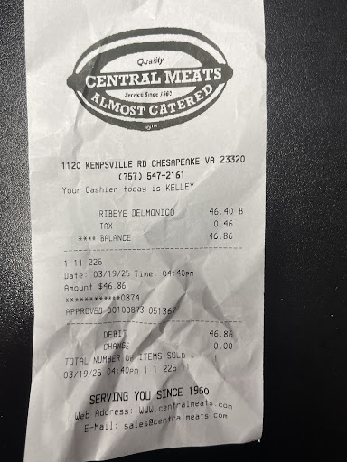 Read moreYesterday, 03/19/25, I came to Central Meats to buy 2 ribeye steaks to grill since it was such a nice day out. This was my first time ever buying any kind of meat from your store. I usually buy my steaks when they’re on sale at places like Kroger and Harris Teeter but I decided to come to Central Meats because I’ve always been curious as to how they are different from grocery store meat and have heard good things.