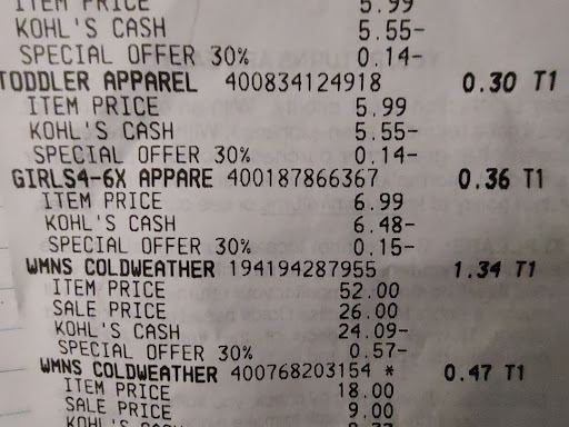 Read moreI experienced discrimination at this location, not sure if it was happening at all of the locations or not. I went into the store to get a pair of Lee jeans. That is pretty much my favorite brand. I wear a 20W and usually find them them in the woman section but couldn't find any this past sunday. I went into the regular size area and found 2 pairs of 20W. They were all marked $ 48.00. The sign said that all bootleg & straight leg jeans that were marked $ 48.00 were on sale for $ 34.99. I went to the checkout and they rang up $ 41.99. I paid for the 2 pair I got and then went back to the display. I found an associate that worked that area and told her that I just paid $ 41.99 for the jeans that were advertised for $34.99. She said that they are Woman's size and did not fall into the sale price. So the regular price on the regular sizes were $ 48.00 and the regular price on the woman's size was $ 48.00. So if the regular price is the same on both, then why is the the sale price different??? You are changing me more because I'm large??? Discrimination at it's best!!! I am closing my account at Kohl's!! I know they don't care,...