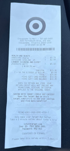 Read moreDear Target Customer Service Team, I am writing to formally report a highly unprofessional and unpleasant experience I had with a cashier during my visit to your store at 3:09 pm on December 26,2024. The address of this store is 4200 Portsmouth Blvd STE 600, Chesapeake, Virginia, 23321. I believe this incident reflects poorly on the excellent customer service I have come to expect from Target. While attempting to use a Target gift card for my purchase, I discovered that the card did not have an access code. I was unaware of this issue prior to my visit, and instead of assisting me in resolving the matter, the cashier accused me of potentially attempting to scam the system. This accusation was completely baseless, offensive, and inappropriate. Adding to my frustration, the cashier dismissed me by stating, “ Find someone else’s time to waste, “ in an unprofessional and condescending tone. This response made me feel disrespected and unwelcome. Furthermore, the cashier openly complained that he should have been off work ten minutes prior, making it clear that he was more concerned with leaving than providing adequate customer service. His attitude was rude, dismissive, and completely unacceptable. As a loyal customer, I expect your team to uphold a standard of professionalism and respect, regardless of the circumstances. This experience left me feeling frustrated, and I believe it warrants immediate attention. I request that this situation should be addressed with the staff member involved and that additional training be provided to ensure no other customer has to endure such treatment. Additionally, I would appreciate clarification on how to resolve the issue with my gift card, as it remains unresolved. Thank you for your time and understanding. I do look forward to hearing from you regarding...