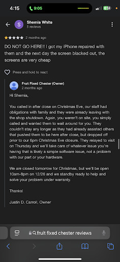 Read moreI left my Apple Watch to have the battery replaced. Max called to tell me it was finished. When I went in to pick it up, I wasn’t able to test the battery because another employee said they had not charged it. That they never do that. (?) So I took it home and left it on my charger overnight and it was no better than when I had taken it in the first time. I returned to the store and a 3rd employee (not Max) was there who wouldn’t even listen to my complaint, Acknowledge that this was a very important health device for me, or answer any questions other than to say, it won’t be done today because our person who sanders doesn’t come in until tomorrow. I asked if I could speak to Max, who was very caring when I first brought it in, but they said she doesn’t come in until tomorrow either. As I write this review, I just picked up my watch from Max and it’s working perfectly so far. Kudos to Max for being the Customer representative that I will...