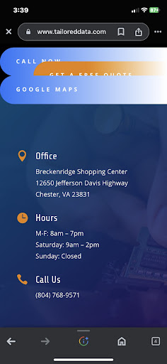 I was told by tmobile down the street to take my phone there for the front of my screen to be fixed. Tailored Data Solutions told me it would take 3 days. 7 days later I picked it up because they still didn't have the part in and I found another company who had it in and I could get it back in 3 hours. When I got it back, the BACK had two impacts on it and my sim was backwards. Now I don't know the damage but at the time I was extremely sick and ended up spending a week in the hospital with an infection. We called back to ask about it and got hung up on several times, then the tech, who called himself a "doctor" got verbal with me on the phone. I still need to turn my phone in to the police and it has been almost 2 months. I couldn't afford a new screen anymore because my fiancé's daughter had a surprise wedding up in ohio! I have lost more than half of my omline customers of my business, and had to buy a new phone for $500, and that was with $800 off. Tailored Data Solutions also deleted their last Google page to cover their butts in order to remove my review there. None of this is opinions I have about them. It is straight fact based.