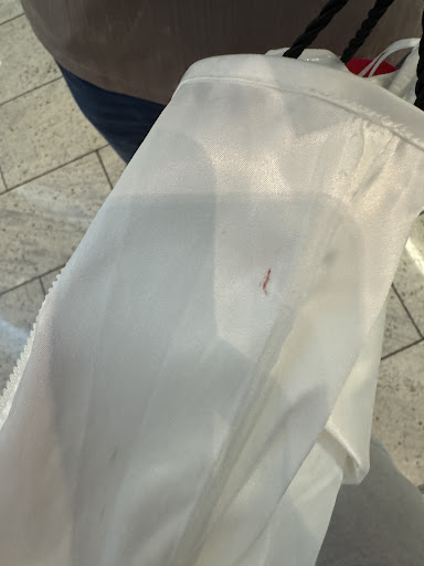After a few minutes, the manager says to me over the counter they can't accept my exchange or sell the dress to another customer because the dress has an oil stain. First, I ask to see the stain and, after taking many seconds to do so, they show me what appears as a droplet close to the inner seam of the dress. Second, I then ask how do they know that this "oil stain" came from me? Many people try on clothes in store; it would be very easy to stain a tight fitting dress after one wear. The manager explains that this "oil stain" could only come from wearing a dress for an extended amount of time. Third, I place my finger over the "oil stain" and it is wet. I explain that I had a drink hanging over my shopping bag that likely was dripping water into the bag and onto the dress. Not accepting this explanation, the manager says the droplet did not appear on the outside seam of the dress so they can't believe that.