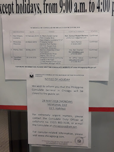 Called many times and emailed and they never answered... Trying to find out about 2019 Consular Outreach, nothing scheduled for Minnesota. So have to fly to Philippines to renew passport? But found out in July outreach was in August in MN, but they said they had reached their total for 200, they would not squeeze in one more, and I'd bet ya there wasn't 200 people who showed up for that outreach and for some dumb reason they do not post the outreach schedule on their web site but on Face book. So we ended up driving to Chicago from MN in Oct. to renew passport. We got to the Consulate around 8:45am on a Thursday and took a paper number right away, there were only 2 or 3 people a head of me in line but an older lady butted in line with a higher number and they let her go ahead I/we didn't say nothing. The workers there have a so-so attitude...but all went well, had all my paper work prepared, ready and in order along with my old passport & money to pay, I'd give them 3 stars for at the Consulate... We were in and out of the Consulate in about a half hour...the worst part was riding all the way up to the Consulate and then all the way back down in that old creaky elevator, yikes! It cost us $25.00 for parking for 40 minutes, Ouch! We left MN around at 11:00 pm to Chicago and was there the next day-downtown Chicago around 8:15 am, we stopped many times on the way there for gas, eating & bathroom breaks. After finishing at the consulate we headed back to MN right away and was back home around 5:30 pm so it was about an 18 hour or so around trip. We didn't want to go to the Consulate on a Friday encase there was a problem with paper work and had to stay the night to fix it, their not open on weekends. It would be nice if they had the Consulate or another one at-in Chicago airport or next door to it, one could just fly in the morning go right to the consulate at Chicago O'hare do there stuff at the consulate, then get something to eat and catch a flight back later that day...save a lot...
