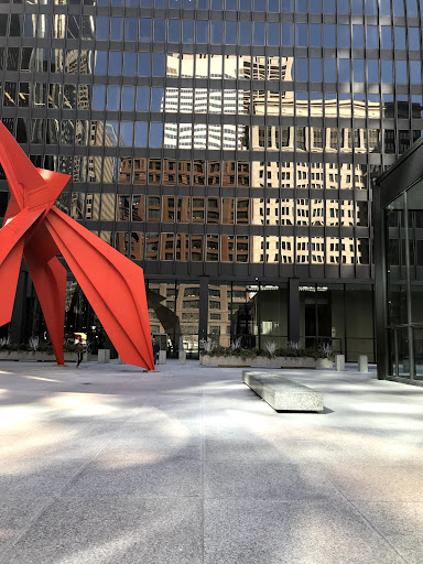 My favorite part of the plaza is the splash of color and this is provided by Alexander Calder's red sculpture. It is a 53 foot Flamingo just hanging out in a sea of grey tones. It was commissioned by the Government and then installed in 1974. There was a great celebration to honor the artist, in fact they had a parade for him in which, Alex Calder sat in a circus wagon that was drawn by 40 horses. Now that is a party!