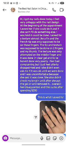 Now I don't want to bash a whole salon because of one bad technician. I have gotten nails done there before that looked amazing. However, I reached out to them about being unhappy with my service and I was left on read for 16 hours. They offered nothing to fix the problems. I was only told they'll do better on my refill.. I guess they don't care about making their customers happy. What is my incentive to come back after such a poor response. Offer to do my design for free next time or a discount.. being told they'll just do better is very poor business practice. This is a business and you need to keep customers happy.