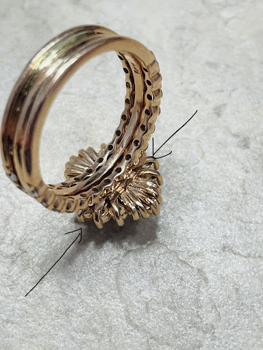 I took my ring in to have the bands on each side removed. I was warned that if I removed the bands the main ring would have more wear on it, but I was not bothered by that chance. I was the only one in the shop after a few people had been helped and left (reference 1). The man behind the counter is using his magnifying glasses to inspect my ring. He points out that thereâs some discoloration on a band (ref 2). I shortly explained Iâve used another jeweler in town to make and attach my bands. Throughout the 5 minutes of him looking at my ring, and us talking, that was the only remark he had (ref 3). He gives me a slip, tells me it will have to be cleaned and then they can start. I get a call in 2 days. They have cleaned my ring and now notice it has been drastically cut on the bottom prongs from the jeweler I went to previously when setting the bands. So much that the ring has no support underneath and also tells me it looks BENT. They want me to come look at it. I immediately did not have a good feeling about this.