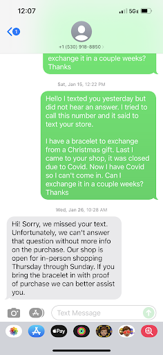 I am really disappointed to write this review, and even more disappointed in this establishment. I do my best to shop small, but in this case, I will never give them my business again and I encourage all who read this to follow suit. My mom purchased my sister and I some items for Christmas on December 21. The first bracelet she gave me was not comfortable so she exchanged it on December 28 for a wrap bracelet that was defective and did not fit an average size female wrist. We went to the store in early January to exchange it and they were closed due to Covid. I sent them a text message on January 14 because they don't answer their phone and the voice message states to text them. I let them know about the defective bracelet and that we attempted to come in but that the shop was closed. I went on to explain that we have Covid and asked if I could come in a few weeks to exchange it. No reply. So I texted again the following day. On January 25, someone finally responded stating that we needed to come in to address the issue. Fine with me- I'll be in once we are no longer dealing with Covid because that's what you do in a pandemic, right? Fast forward to today, February 12. I explained the situation and the store owner found the transaction on their computer. The item I wanted to return was still stocked in the store, unused, and had tags attached. The owner twisted herself into a pretzel to explain "her side", which was: the original purchase was so long ago and had been bought with store credit so they couldn't do anything. She stated they extended their return policy because of their covid closure, however, because of our covid situation and quarantine, I was unable to come in. Which is why I texted them in the first place! Later in the day, my mom even tried to exchange the bracelet since she was the one who spent 100's of dollars there over Christmas and was extremely frustrated with their response. She was unfortunately treated by the owner with the same stubborn and rude demeanor.