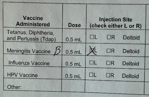 They eventually had the pharmacist fill out a school record form and she literally hand wrote "B" next to the pre-printed "Meningitis" entry.