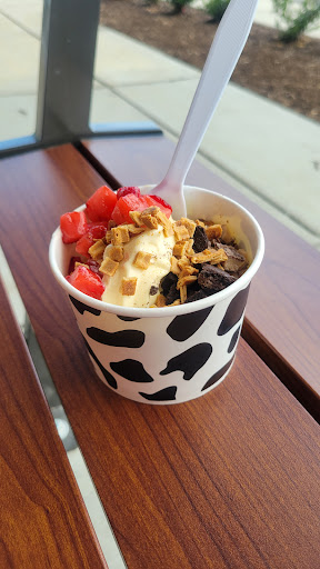 Glad to see a froyo option in Cburg. I was greeted as soon as I arrived and she offered to help with anything if needed. And when I was done making my bowl she was quick to get me rang out. Very good, attentive service. There are currently a limited number of flavor choices, but still a good variety. The pricing is not by weight and instead by cup size. The cup size I got is $5, then there are a couple other size options as well as cones and floats available to choose from. There are numerous toppings and drizzled available but most are desert style. There were a couple of fruit options but I would love to see more of those like blueberries, raspberry, pineapple. I got the cake batter yogurt and topped it with heath, waffle cone, and strawberries. It was delicious and I will visit again. Additionally, there is plenty of seating inside but some additional seating outside would make it...