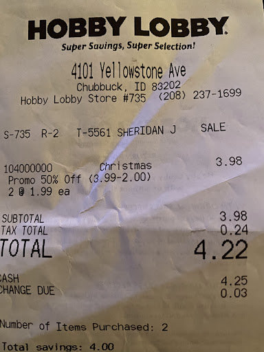 Read morePoor customer service at this Hobby Lobby, BEWARE! I was visiting with a friend tonight and needed assistance finding a 4th Christmas ornament as I had picked out 3 of the same one and needed the 4th to compete the set. I saw an Associate and asked for assistance. His name was “Shane”. He reluctantly came over and I explained what I was looking for. He said everything that they have is out. He said that Hobby Lobby has “an antiquated inventory system and they do not have the ability to locate items in the store” so how do they do inventory? Puzzling... i asked if he could help me look in the store? He said I could look up on the top shelves of the store for my desired item. Again, isn’t that HIS job? Sad. His lack of interest was disturbing. I thought the customer was more important then putting up stickers and price tags? Because after he walked away that’s what he went back too. It’s appears the priorities are off here. Chubbuck, Idaho, in general has issues and struggles with customer service and hospitality and this is just another example. I will most likely never return to this store until they reach out to me and repair this broken situation. I guess Hobby Lobby doesn’t need...
